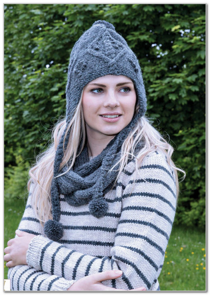 Вам потребуется: пряжа Twilleys Freedom Alfresco Aran (80% мериносовая шерсть, 20% альпака, 50 г/80 м) - 200 г для шарфа и 150 г для шапки серо-голубого цвета (106 Mole), спицы 4,5 мм и 5,0 мм, вспомогательная спица для кос.