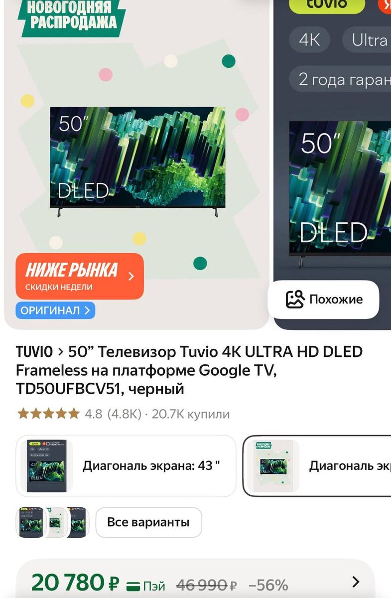 50” Телевизор Tuvio 4К ULTRA HD DLED Frameless на платформе Google TV, TD50UFBCV51, черный