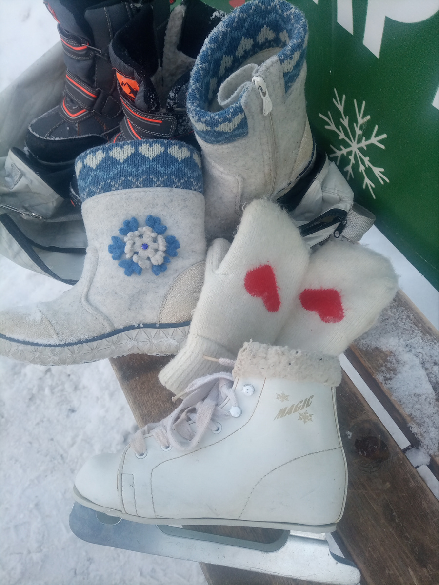 Сегодня мы с детьми, дочкой и сыном, отправились на каток. Я сама, признаюсь, на коньках стоять не умею, но их учу. Точно так же, как не умею кататься на лыжах, но детей этому тоже учу. И на велосипеде я сама не езжу, но им показала, как это делается, кататься они умеют. С