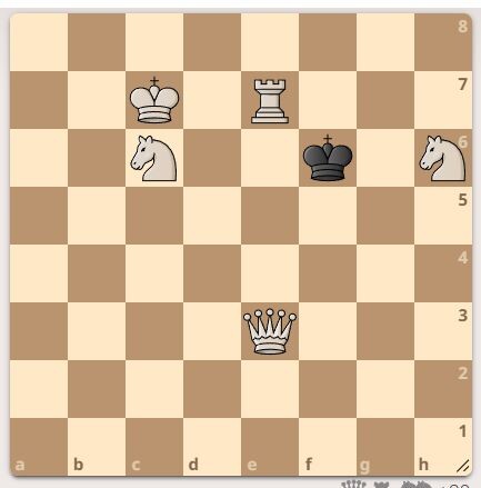 Черный король на "f6". У белых два коня, ладья и ферзь. Автор задачи А. Панкратьев, 2006 год. Сосед не смог найти простой мат в 2 хода. Ход белых. Подписывайтесь и ставьте лайк, не забудьте поддержать автора на Рождество. Первый верный ход смотрите в галерее.