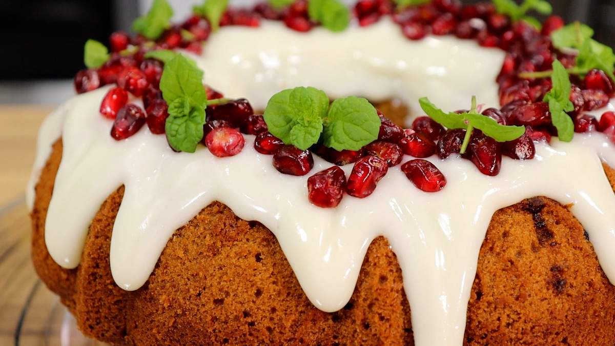 Рождественский кекс – это аромат уюта и ожидания праздника. Кофе, ваниль и шоколад наполняют дом теплом, а нежная текстура и сливочная глазурь делают его по-настоящему особенным. Сегодня приготовим простой, но очень праздничный рождественский кекс для уютных зимних вечеров. Тесто: сливочное масло (мягкое) – 150 г; соль – щепотка; ванилин – щепотка; яйца – 3 шт.; сахар – 250 г; мука – 260 г; разрыхлитель – 1 ч.л.; молоко (тёплое) – 150 мл; кофе (растворимый) – 3 ст.л.; шоколадные капли (термостабильные) – 30 г. Глазурь: сливочный сыр – 70 г; сахарная пудра – 120 г; лимонный сок – 1 ст.л. Декор: свежая мята; зёрна граната. В большую миску кладём 150 г мягкого сливочного масла, добавляем по щепотки соли и ванилина, высыпаем 250 г сахара и перемешиваем лопаткой. Далее взбиваем масло с сахаром миксером до светлого цвета и кремовой, воздушной текстуры. Добавляем по-одному три яйца, каждый раз хорошо взбивая. Все ингредиенты должны быть комнатной температуры, особенно масло и яйца – это ключ