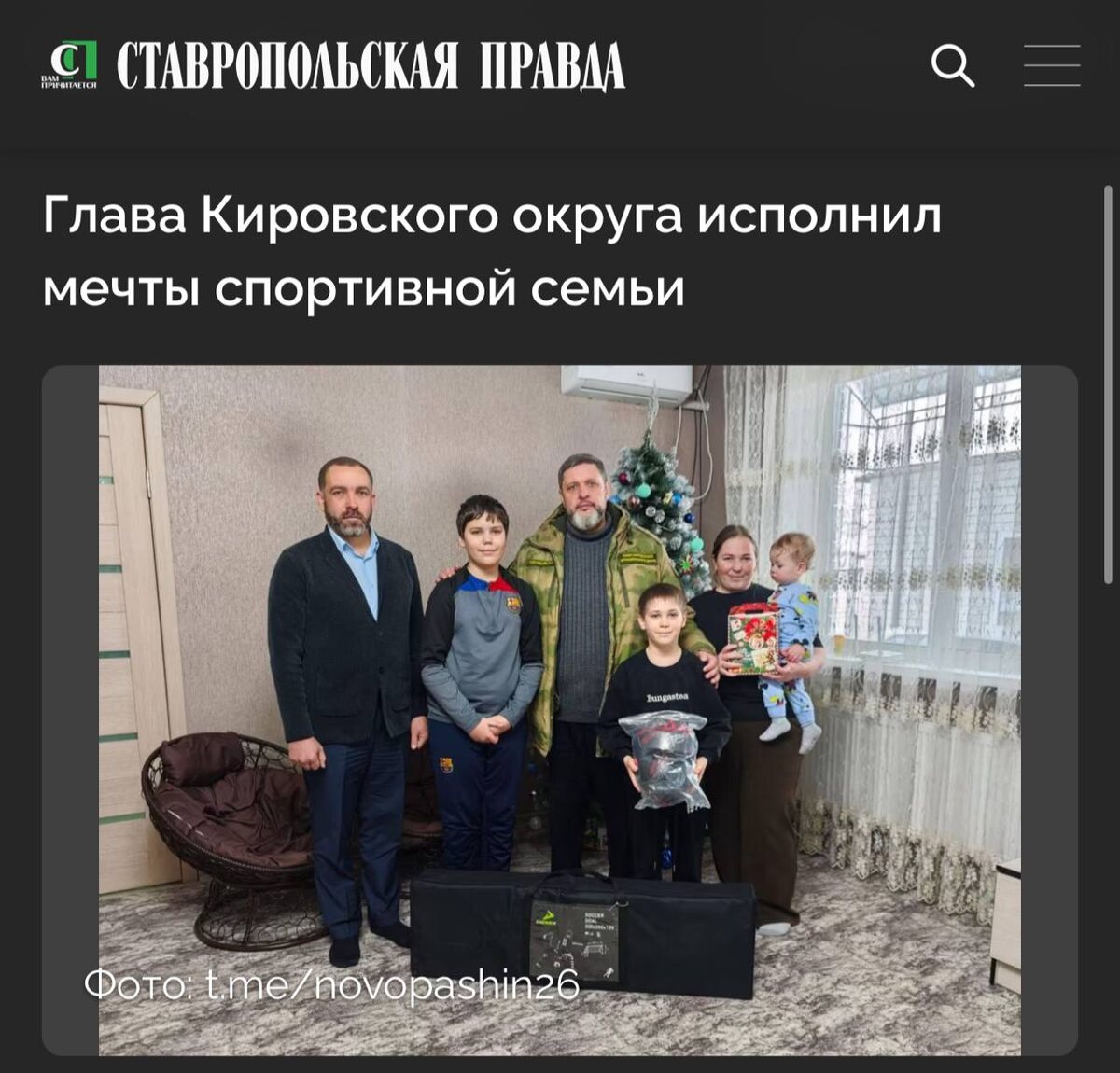 В рамках благотворительной акции «Ёлка желаний» глава Кировского округа Николай Новопашин вручил подарки семье Мещеряковых. Три брата — Саша, Данила и Максим — всерьёз увлечены спортом. В этом году ребята загадали два подарка: футбольные ворота и спортивный шлем. Оба желания были оперативно исполнены. «Помогая осуществлять мечты детей, мы не только поддерживаем их увлечения, но и укрепляем веру в волшебство и добрые дела, — подчеркнул Николай Новопашин. — Пусть этот год станет для семьи Мещеряковых наполненным новыми победами, здоровьем и счастьем!» Акция «Ёлка желаний» продолжает объединять неравнодушных людей, помогая воплотить в жизнь новогодние мечты детей. Ранее полпред президента в СКФО и губернатор Владимир Владимиров исполнили желание юного эколога из Пятигорска