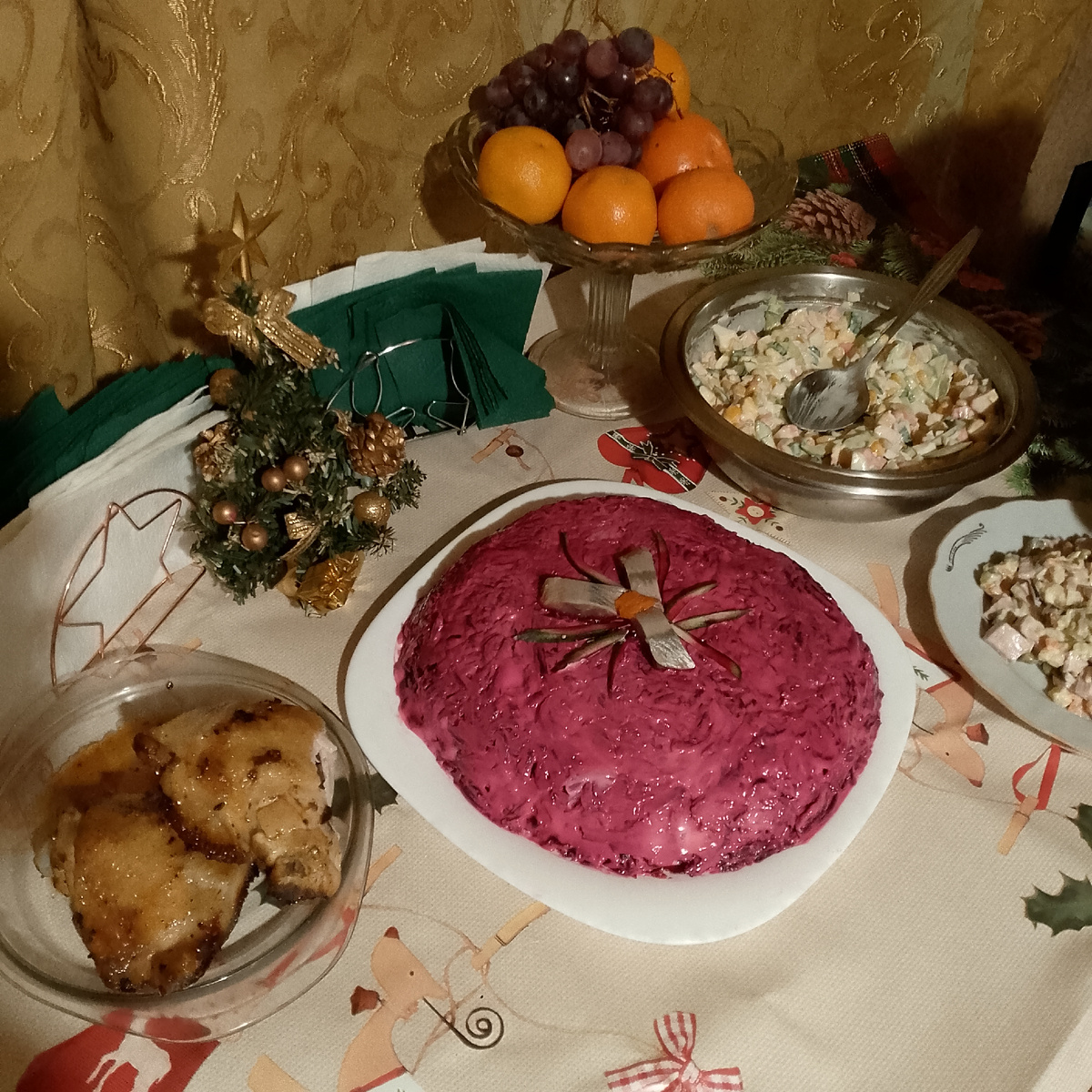 Всё было традиционно и вкусно. Селёдку под шубой быстро умяли, мы оба любим. Была у меня весовая и в банке я их перемешала вместе и делала побольше даже для нас двоих. Гостей не ждали.
