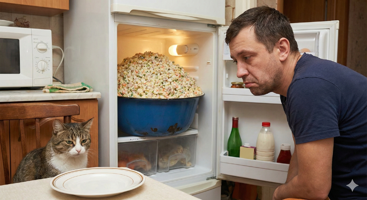 Третьего января я понял, что салат меня переживёт. Он стоял в холодильнике. Огромный. В синем тазу с отбитой эмалью. Смотрел на меня. Я смотрел на него. Между нами была химия. Точнее — майонез. Супруга, женщина ответственная, подошла к новогодней готовке как к вопросу государственной важности. «На всякий случай побольше», — сказала она тридцать первого декабря. И осуществила. Первого января оливье ещё радовал. Второго — вызывал уважение. Третьего я открыл холодильник и обнаружил, что его не стало меньше. Ни на грамм. Я проверил. Может, там внутри что-то размножается. — Надо доесть, — сказал я за завтраком.