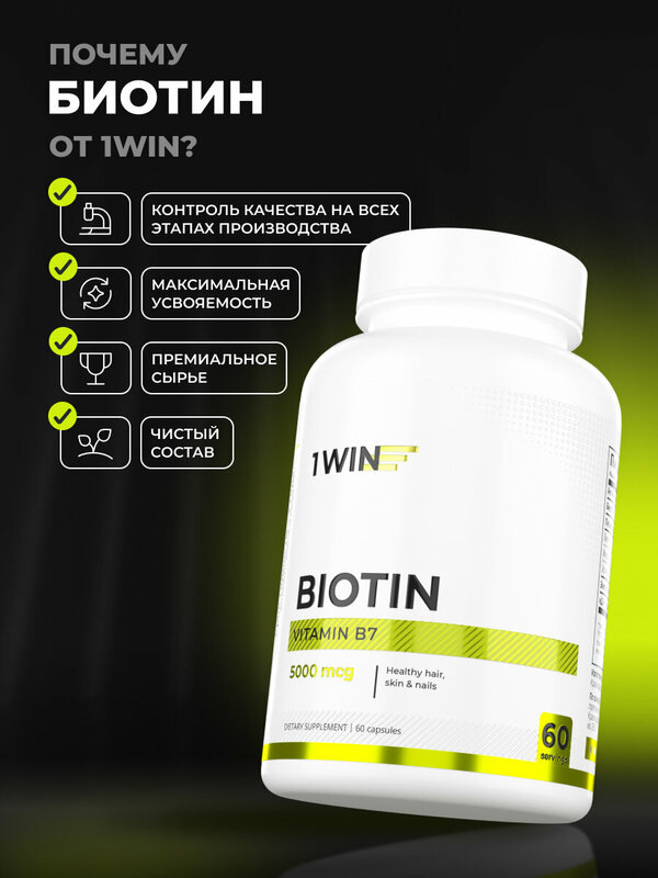 Биотин — это витамин группы В (В7), который играет ключевую роль в здоровье волос, кожи и ногтей. Биотин 5000 мкг в упаковке на 60 таблеток от 1WIN — это высококонцентрированный комплекс, разработанный специально для женщин, стремящихся улучшить свой внешний вид и общее состояние.