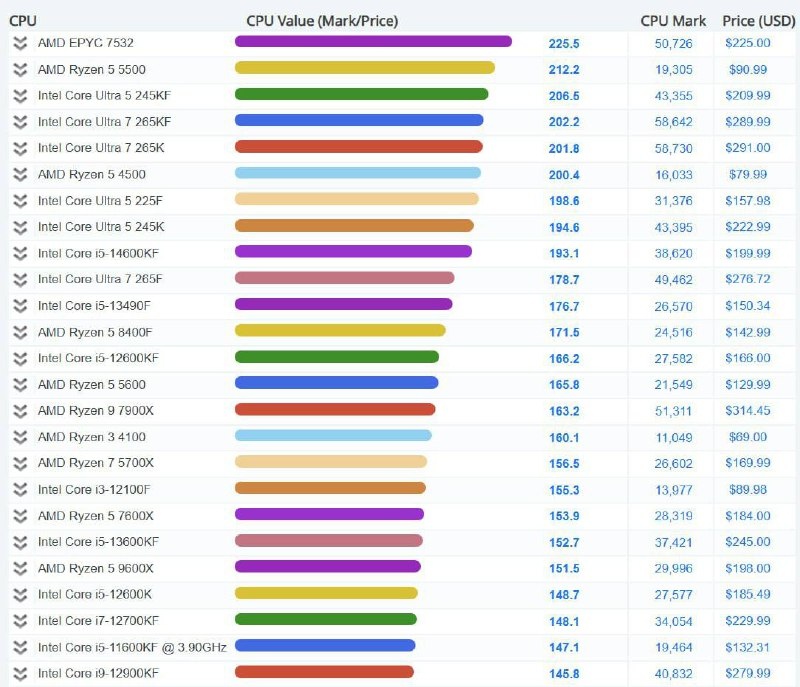 Intel заняла 7 мест в топ-10 рейтинга CPU с лучшим соотношением цены и производительности по версии PassMark