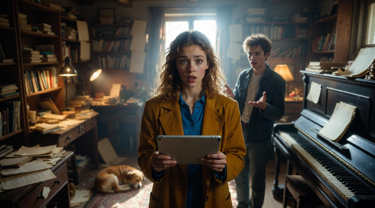 Перед уходом, уже надевая пальто, она в последний раз оглядела студию. Теперь она видела не просто беспорядок. Она видела следы процесса. Заляпанные чаем ноты — значит, работал долго и увлечённо. Протёртые клавиши — значит, играет много и с чувством. Пёс, спящий рядом — значит, здесь не просто работают, а живут.