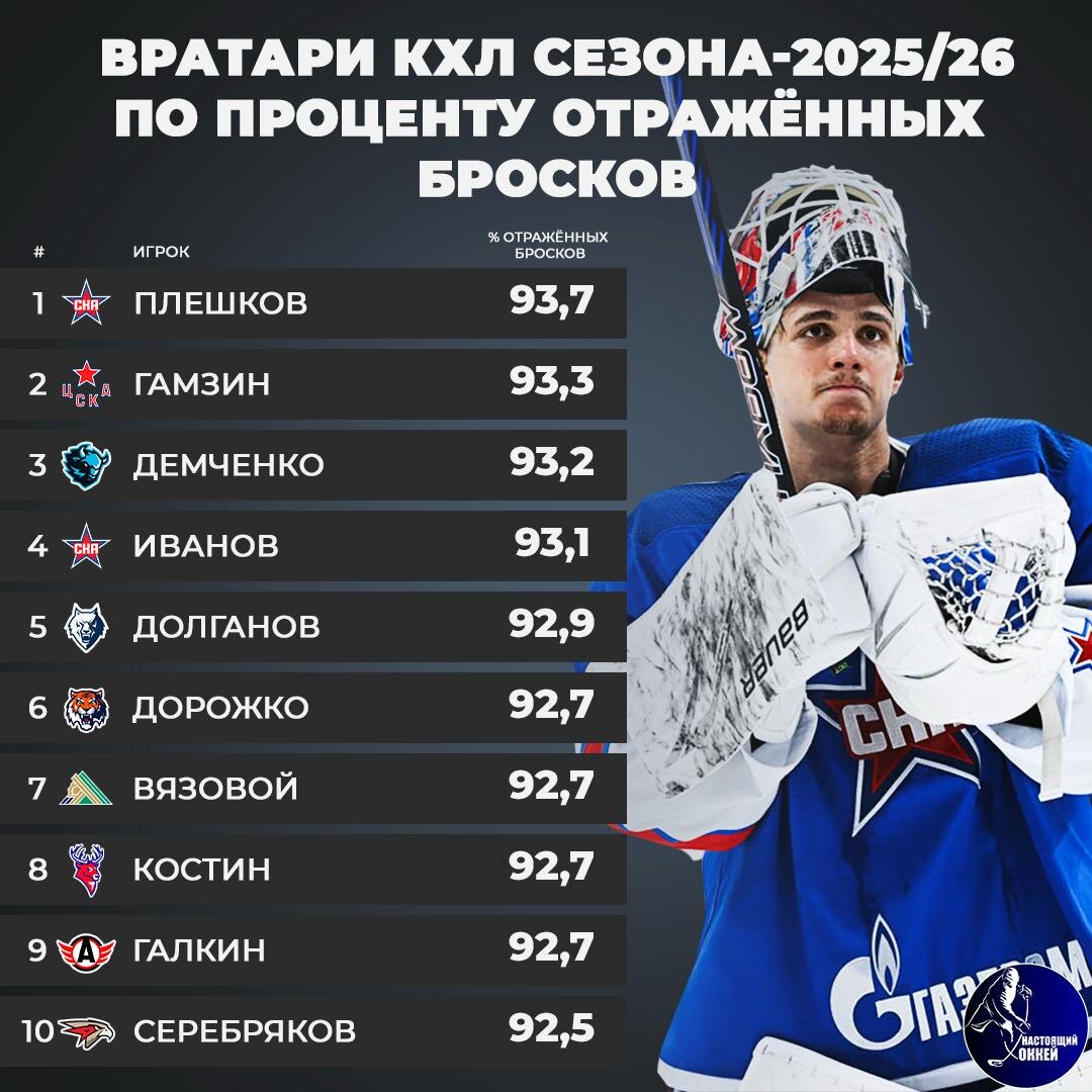 ⚡️🥅 Вратари сезона КХЛ по проценту отражённых бросков