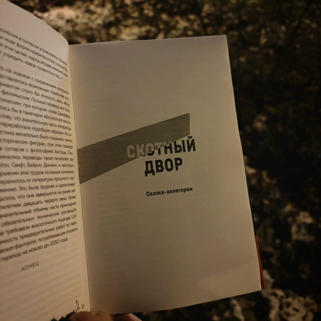 ВСЕ ЖИВОТНЫЕ РАВНЫ, НО НЕКОТОРЫЕ РАВНЕЕ ДРУГИХ «Скотный двор» — ответвление тоталитарной философии Оруэлла через добротную сказку-аллегорию. Весь смысл умещается в одну выдержку из книги «1984», представленную ниже: Цель Высших — оставаться на своём месте. Цель Средних — поменяться местами с Высшими. Цель Низших, когда у них есть цель, — собственно, Низших и отличает, что они слишком задавлены тяжким трудом и только урывками сознают что-либо вне своей рутинной жизни, — стереть все различия и создать общество, в котором все будут равны. Таким образом, на протяжении всей истории вновь и вновь вспыхивает, по существу, одна и та же борьба. Сказка подразумевает определённую долю забавных, на первый взгляд, условностей: фермерские животные общаются, осмысленно взаимодействуют, представляют собой, по сути, различные человеческие архетипы, да и в самих фермах не трудно углядеть уже знакомые нам по «1984» миниатюры сверхгосударств: Океания, Евразия и Остазия. Но на этот раз правящей Партии в ли