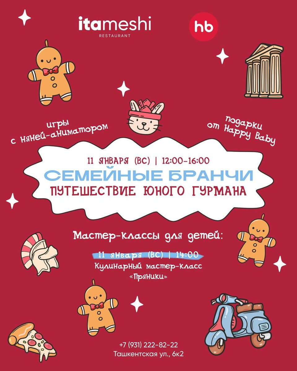 В ресторане Itameshi на первом этаже ARTSTUDIO M103 по традиции проходят семейные бранчи с мастер-классами для детей: уютно, познавательно и по-настоящему по-зимнему. 🧑🍳 Кулинарные мастер-классы: • 11 января (вс), 14:00 — «Пряники» • 18 января (вс), 14:00 — «Пицца» • 25 января (вс), 14:00 — «Тирамису» 🎨 Творческие мастер-классы: • 17 января (сб), 14:00 — «Гирлянды» • 24 января (сб), 14:00 — «Фешн снеговик» • 31 января (сб), 14:00 — «Подсвечник» Для детей — игры, творчество и новые впечатления, для родителей — спокойный бранч и возможность провести время всей семьёй в приятной атмосфере. 📍 Ресторан Itameshi, ул. Ташкентская, 6к2 🕐 Выходные января | начало мастер-классов в 14:00 Будем рады видеть вас на январских семейных бранчах 💛