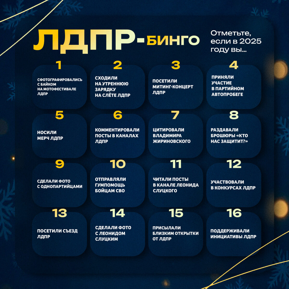 Подписывайтесь на канал ЛДПР, собирайте бинго и делитесь в комментариях, сколько пунктов совпало!