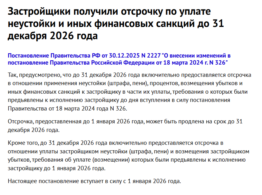 Под Новый год правительство сделало застройщикам своеобразный подарок - мораторий отменили, но приняли поправки о невзимании штрафов, которые возникли до 01.01.2026 года, т.е. дольщики могут истребовать только те неустойки, которые возникнут с 01 января 2026 года. Поправьте меня, если я неправильно понял это постановление