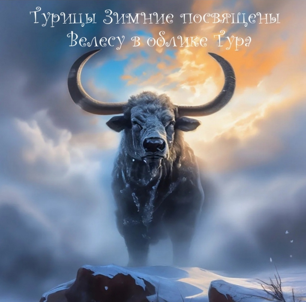 Турицы Зимние посвящены Велесу Мудрому, Велесу Волхву и Магу в обличье древнего Тура. Тур - огромный первобытный дикий европейский Бык, прародитель современного крупного рогатого скота. Это сильное, смелое, выносливое, свирепое и грозное животное, которое, к сожалению, к настоящему времени вымерло и занесено в Красную книгу, как исчезнувший вид.