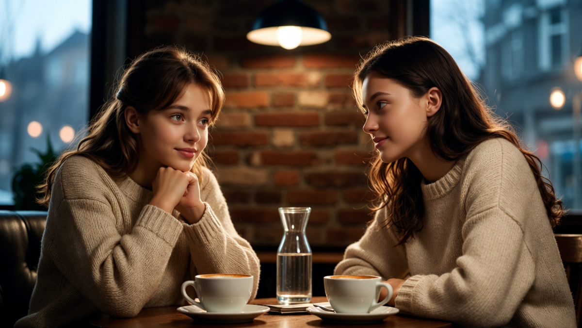 «Маленькая Италия» оказалась крошечным, но уютным кафе с запахом свежей пасты и эспрессо. Вика уже сидела за столиком в углу, сняв пальто. На этот раз она выглядела проще — в тёмном свитере и джинсах, без ноутбука.
