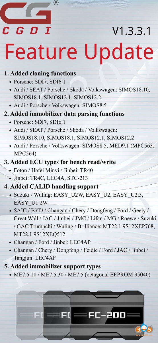 📰 OBDII365.com Official Blog Устройство для программирования ЭБУ CG FC200 обновилось до версии V1.3.3.1. В обновлении добавлены функции клонирования для систем Porsche SDI7, SDI6.1 и для Audi/SEAT/Porsche/Skoda/Volkswagen с использованием SIMOS18.10, SIMOS18.1, SIMOS12.1, SIMOS12.2, SIMOS8.5. Также добавлены функции разбора данных иммобилайзера и поддержка работы с типами ЭБУ Foton, Hafei Minyi, Jinbei. 🔗 Читать полностью #новости #автодиагностика #автоключи #audi #bmw #ecu #linbus #porsche #volkswagen #иммобилайзер #программирование