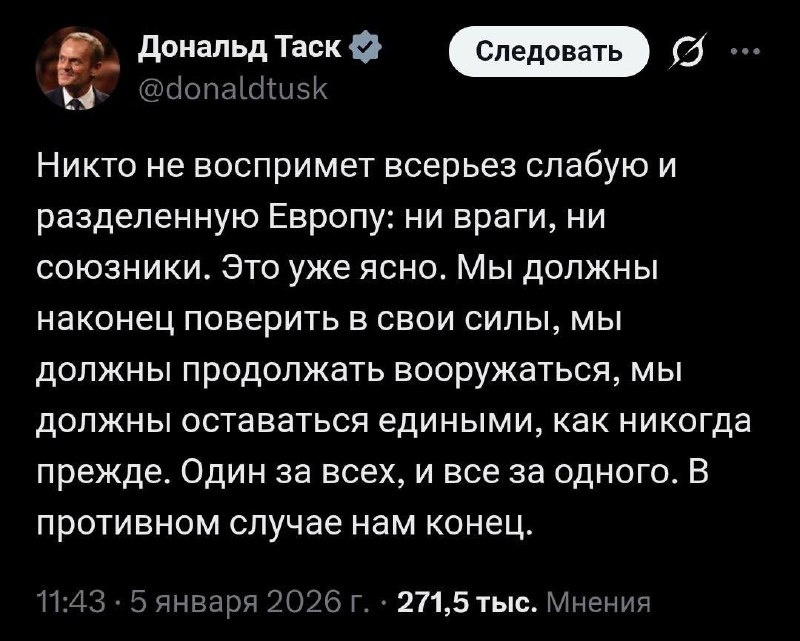 Один за всех, и все за одного, — премьер Польши Туск. Никто не воспримет всерьез слабую и разделенную Европу: ни враги, ни союзники. Это уже ясно. Мы должны наконец поверить в свои силы, мы должны продолжать вооружаться, мы должны оставаться едиными, как никогда прежде. Один за всех, и все за одного. В противном случае нам конец.