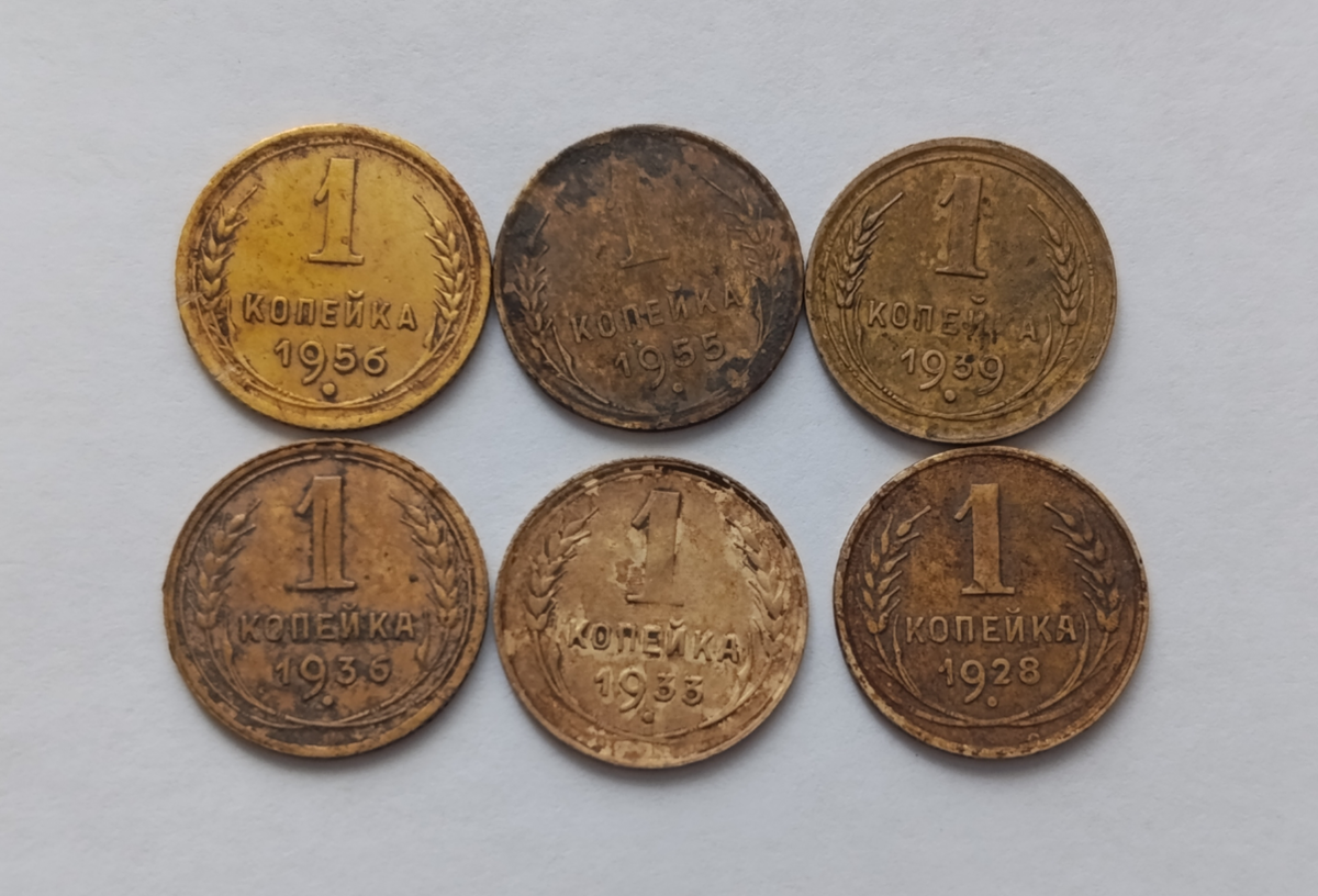 Люблю советские бронзовые копеечки. Особенно, если они без признаков гнили и прочих неприятных налётов. Сегодня дошли руки почистить вот такие шесть прекрасных копеек, имеющих неплохие перспективы в чистке: Бронзу я чищу одним способом, который меня полностью устраивает. Первый этап - монеты помещаются в слабокислую среду. К примеру, я использую раствор лимонной кислоты. Кислотность должна быть такой, что если кто-то вдруг решил испить содержимое, то просто бы поморщился от "кислинки". В этом случае монеты сложно "передержать". А если передержать, то они просто покраснеют. Далее при помощи латунной щеточки с более-менее мягким ворсом я удаляю всё ненужное с поверхности монет, чтобы они приняли равномерный оттенок. Второй этап - про монетки можно забыть, а вспомнить о них через год. Пусть они даже лежат в альбоме. Примерно через год они сами по себе приобретут красивейший цвет, так как бронза имеет свойство "мутнеть". При этом цвет у монет будет равномерный и однотонный. И вот после