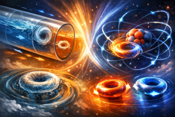 Что, если спин электрона - такой же "наведённый вихрь"? Наша гипотеза заключается в следующем: частица (например, электрон) моделируется как устойчивый тороидальный вихрь некой фундаментальной субстанции. При вхождении в неоднородное магнитное поле этот тор начинает "обтекаться" внешним силовым потоком. Взаимодействие, подобное эффекту Магнуса (возникновение силы при обтекании вращающегося тела), заставляет вихревую структуру развернуться и "защёлкнуться" в одно из двух устойчивых состояний относительно поля: циркуляция либо по часовой стрелке, либо против.