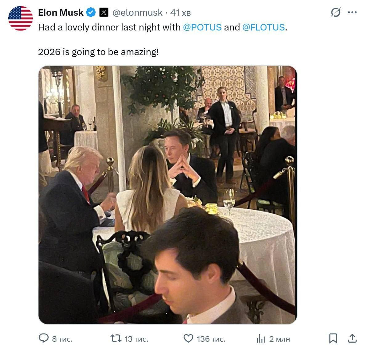 Илон Маск поужинал с Трампом и объявил что 2026 год будет восхитительным