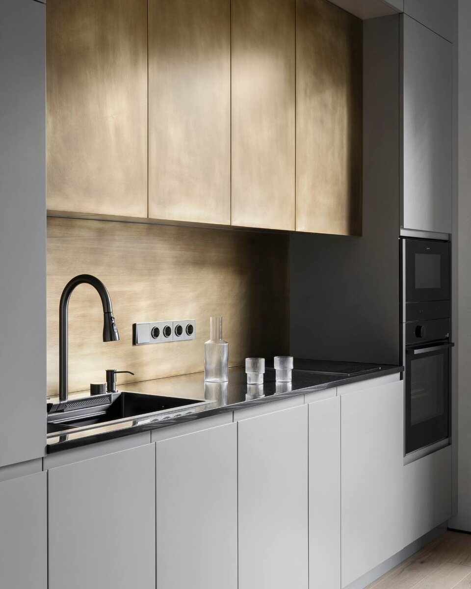 Смелый заказчик был открыт к экспериментам и предложениям дизайнера Натальи Костиной из студии «Точка дизайна». Единственным пожеланием оставался неподвластный времени характер интерьера, благодаря которому он останется актуальным на долгие годы. Что было реализовано нами: — кухня с фасадами из патинированной латуни — организованная система хранения в прихожей, где стеновая панель, шкаф и зона вешалок собраны в единую конструкцию, — гардеробная система в мастер-зоне, — шкаф с жалюзийными фасадами, интегрированный в стену спальни. — конструктивные элементы для ванной комнаты: • консоль под раковину, • стеновые панели, • элементы подиума и ниши.