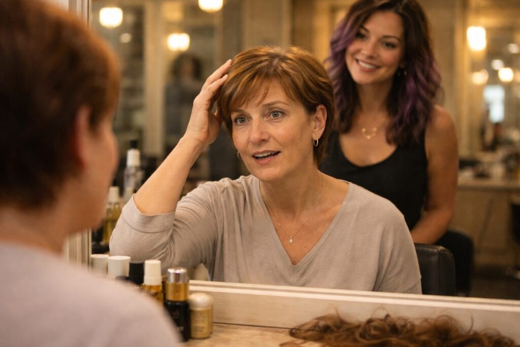 Из зеркала на меня смотрела незнакомая женщина. Волосы — короткие, чуть ниже ушей, с лёгкой укладкой. Цвет — тёплый каштановый, без седины. Лицо — то же самое, но другое. Открытое. Моложе?