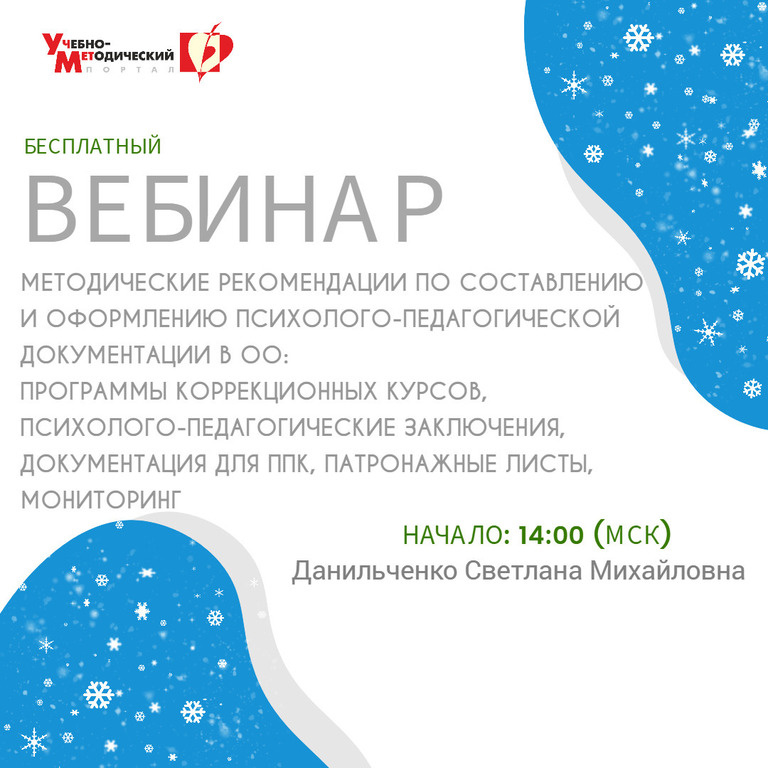 , психолого-педагогические заключения, документация для ППк, патронажные листы, мониторинг» Дата проведения: 06.01.2026 Начало: 14:00 (МСК) https://www.uchmet.ru/events/item/4029631/ Психолого-педагогическое сопровождение образовательного процесса требует ведения соответствующей документации, которая позволяет проследить динамику изменения в развитии отдельных обучающихся и классных коллективов. Вебинар проанализирует структуру программ коррекционных курсов и приведет примеры таких программ, а также покажет, как составлять психолого-педагогическое заключение, в том числе по разным запросам, строить вероятностный прогноз и ставить психологический диагноз. Ведущий вебинара представит разные виды документации для ППк: протоколы, заключения, рекомендации и др. В содержание мероприятия будут включены патронажные листы, отражающие содержание и систематичность психолого-педагогического сопровождения детей с поведенческими девиациями (в частности, делинквентов) и формулировки задач такого с