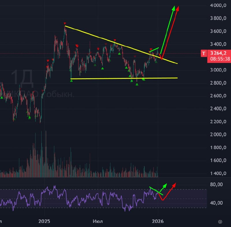 🏦 Т-банк 🟢 Последний раз писал в Т-банке в марте прошлого года. когда там были дикий разгон с сигналом на продажу. Теперь уже понятно, чем всё закончилось. 🟢 В текущий момент у нас есть слом верхней наклонной линии. Возможно, даже существует некий треугольник. Отметил его желтым. При пробое верхней границы наклонки появилась дивергенция. 🟢 Если сломаем дивергенцию. то цена выйдет вверх на высоту треугольника. Если не сломаем, то идем на тест пробитой наклонки, после чего буду ждать рост на высоту треугольника. Вариант с движением к нижней границе треугольника маловероятен, так что его не рисую даже. 🚗 Получается, по графику Т-банк жду выше. Ну а пока что подписывайтесь на меня в пульсе, т.к. веду с тех поддержкой ожесточенные бои за плюшки для подписчиков. #tcsg #t #tinkoff #ткс #ттехнологии #bogdanoffinvest $T $TBH6