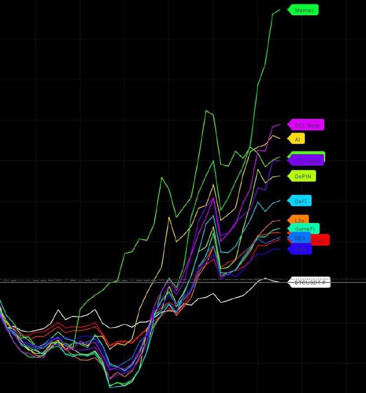 Memecoins are among the top performers, with the Solana ecosystem showing signs of market outperformance. AI and ETH beta sectors are also moving higher, while $BTC trades sideways.