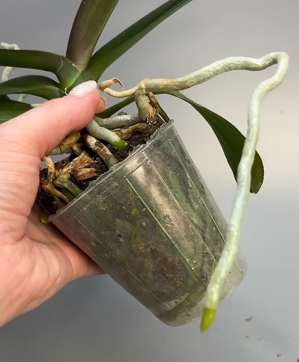 Привет. Сегодня у меня очередная пересадка орхидеи. Я уже заранее замочила корневую систему, чтобы корни напитались влагой и были гибкими. Убираю весь старый мох, плохие корни, сухие кончики. Вот эти светлые корни внутри, это нормально. Они становятся такими, потому что не получают цвет. Отрезаю сухие цветоносы и убираю старые чешуки, чтобы это не начало всё гнить в новой посадке. И вот этот нижний листик убираю тоже. И увлажняю верхние воздушные корни, чтобы они тоже стали гибкие. Сегодня в посадке буду использовать фитиль. Для этого беру вот такой шнур, отрезаю нужное количество и достаю у него сердцевину. Кончики вывожу наружу. Высоту фителя в горшке оставляю так, чтобы он не доходил до основания орхидеи. На низ выкладываю хорошо промытый керамзит. Помещаю орхидей в горшок и завожу фитиль между корнями. Заполняю пустоты корой, перемешку самхом. Такой способ посадки на фитиль я использую только для тех орхидей, которые любят попить воду. Так он будет постоянно увлажнять субс