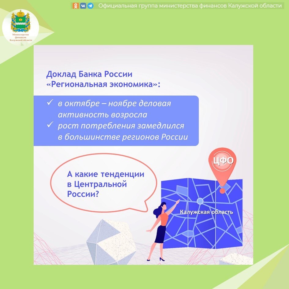 Какие экономические тенденции были в регионах Центрального федерального округа, смотрим в карточках Калужского отделения Банка России.