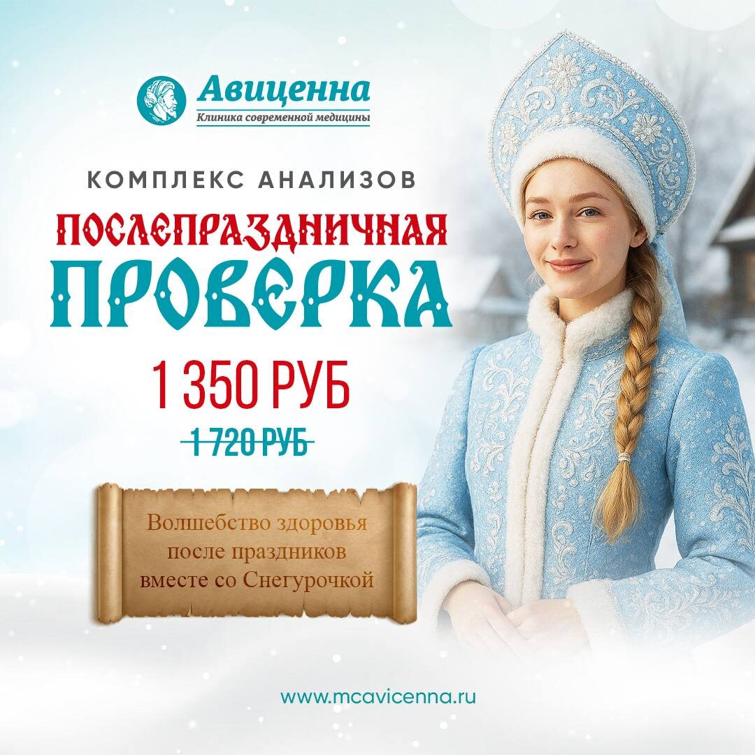 ❄️ После праздников жизнь постепенно возвращается в привычный ритм. Это именно тот период, когда можно уделить внимание себе — без суеты и спешки 🤍 Клиника «Авиценна» подготовила для вас специальные предложения на январь: 🔹 Комплекс анализов «Проверка здоровья после праздников» за 1350 ₽ вместо 1720 ₽ После зимних торжеств организму важно восстановиться. Рекомендуем проверить работу печени, почек и обмен веществ. 🔹 Зимний гинекологический комплекс за 2 900 ₽ вместо 3 665 ₽ Приём ведут специалисты: Елизаров А. А., Матяш О. В., Мерджанова Э. А., Шамшетдинов М. А. 🔹 Зимний урологический комплекс за 2 900 ₽ вместо 3 405 ₽, который помогает вовремя оценить состояние здоровья и сохранить уверенность в себе. 📅 Акции действуют с 2 по 31 января 2026 года Позаботьтесь о своём здоровье вместе с клиникой «Авиценна» 🤍