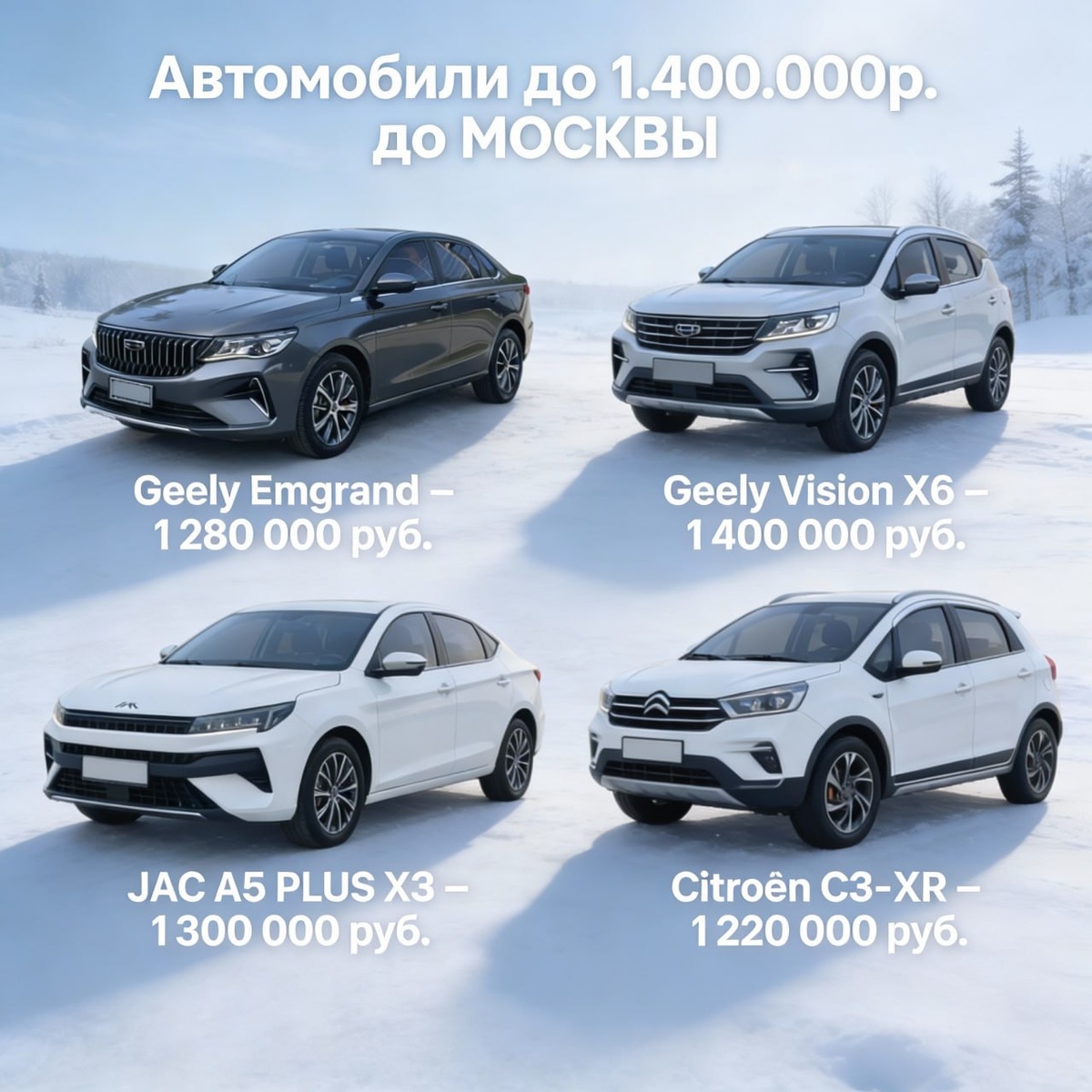 🇨🇳🇨🇳🇨🇳🇨🇳🇨🇳🇨🇳🇨🇳 Устали от старого авто и бесконечных ремонтов? 🚗💨 Мы подготовили 4 автомобиля до 5 лет с бюджетом до 1 400 000₽ — цена «под ключ»: доставка в Москву или любой город РФ, оформление документов, таможня и все расходы уже включены! Почему стоит обратить внимание: ✅ Современный дизайн и новые технологии ✅ Экономичный расход топлива ✅ Идеальный вариант для первого автомобиля ✅ Ликвидность — сохранит стоимость через год ✅ Автомобили почти не изношены ✅ Без пробега по России Не теряйте время на старое авто — выбирайте комфорт и надежность сразу! Geely Emgrand (~1 280 000 руб.) Geely Vision X6 (~1 400 000 руб.) JAC A5 PLUS (~1 300 000 руб.) Geely Vision X3 (~1 250 000 руб.) ‼️Стоимость автомобиля может отличать как в большую🔼 так и в меньшую🔽 сторону в зависимости от пробега, оценки, комплектации, состояния кузова а также текущего курса‼️ 🔽Чтоб получить консультацию и заказать автомобиль свяжитесь с нами по контактам указанным ниже:🔽 Telegram: Павел - ф