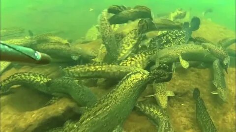 Зрелище не для слабонервных. Самка идет, а вокруг нее вьется клубок из 3-10 самцов. Они буквально обвивают её, трутся боками, помогая выдавливать икру. Образуется такой живой шевелящийся шар.