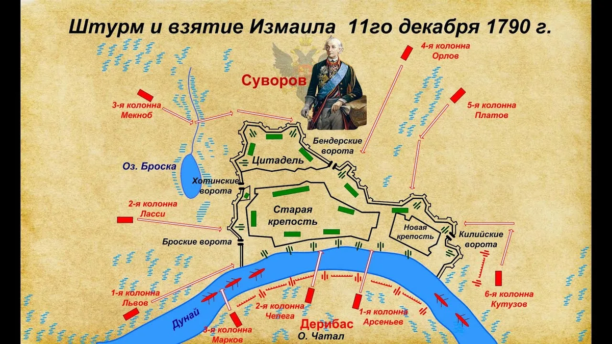 Одной из ключевых колонн в штурме Измаила была колонна под командованием генерал‑майора Михаила Иларионовича Кутузова. Ей была поручена одна из самых сложных задач - атака на Килийские ворота, важный узел обороны на юго‑восточном участке крепости. Перед штурмом Суворов лично поставил Кутузову задачу: Кутузов тщательно подготовил своих солдат: Колонна Кутузова двинулась на приступ одновременно с остальными частями. Условия были крайне тяжёлыми: Солдаты несли с собой: Под огнём янычар кутузовцы: Особо отличились сапёры: они под огнём расчищали подходы и помогали ставить лестницы. Стрелки огнём прикрывали продвижение основных сил. Достигнув ворот, русские солдаты столкнулись с новой преградой - массивными дубовыми створками, усиленными железными полосами. Янычары изнутри пытались удержать их, ведя огонь через бойницы. Кутузов принял решение: После нескольких попыток сапёры смогли подорвать часть ворот. Русские солдаты ворвались внутрь, завязав ожесточённую рукопашную схватку. Прорвавшись