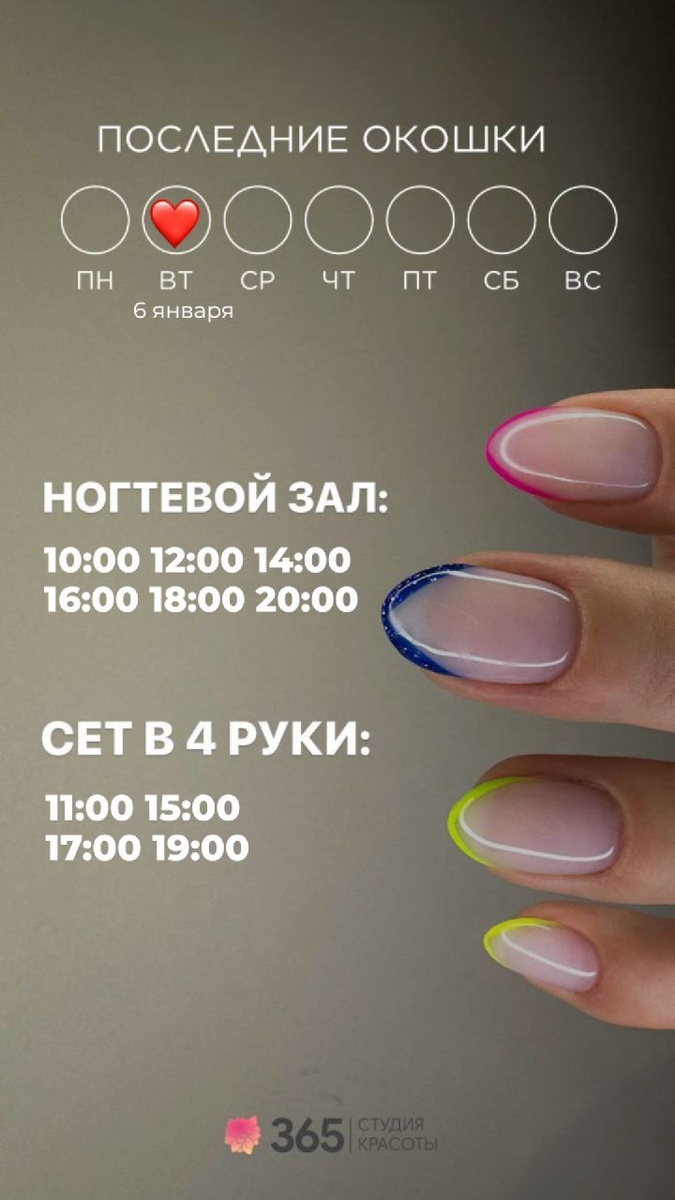 ❤ С новым годом 😀🎉 иии первым рабочим днем в нашей студии 365 🥳 Радуемся каждой встрече и желаем успехов в новом году 🤗💫 Будем рядом, чтобы поддерживать и радовать Вас 🤗❤ #красота #наслаждение #забота #зима #любовь #мечты сбываются #радость #возможности ЧТО МОЖНО УСПЕТЬ СДЕЛАТЬ 06 января 2026 года: Ногтевой зал: 10:00 12:00 14:00 16:00 18:00 20:00 Сет в 4 руки: 11:00 15:00 17:00 19:00 Парикмахерский зал: ближайшая дата для записи 8 января Оформление бровей и ресниц: ближайшая дата для записи 13 января Косметология/шугаринг: ближайшая дата для записи 10 января ЗАПИСАТЬСЯ МОЖНО ЛЮБЫМ УДОБНЫМ СПОСОБОМ: 👉🏻 Сообщение в Whats'app https://wa.me/79663654477 👉🏻По телефону +79663654477 👉🏻Онлайн запись https://n286444.yclients.com/ #команда365 #красота #наслаждение #забота #зима #декабрь #любовь #мечтысбываются #радость #возможности