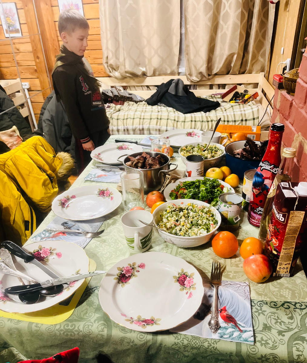 Да и первые дни 2026 прошли ооооочень насыщенно!!! Утром 1января мы проснулись в 11м часу, подтопили печку, я заварила чай и нарезала тортик Наполеон. Продукты к столу оставила на терраске ( она не отапливается), поэтому еда изрядно подмерзла, коржевой тортик приходилось резать, прикладывая большие усилия, он стал твердым, как кирпич!