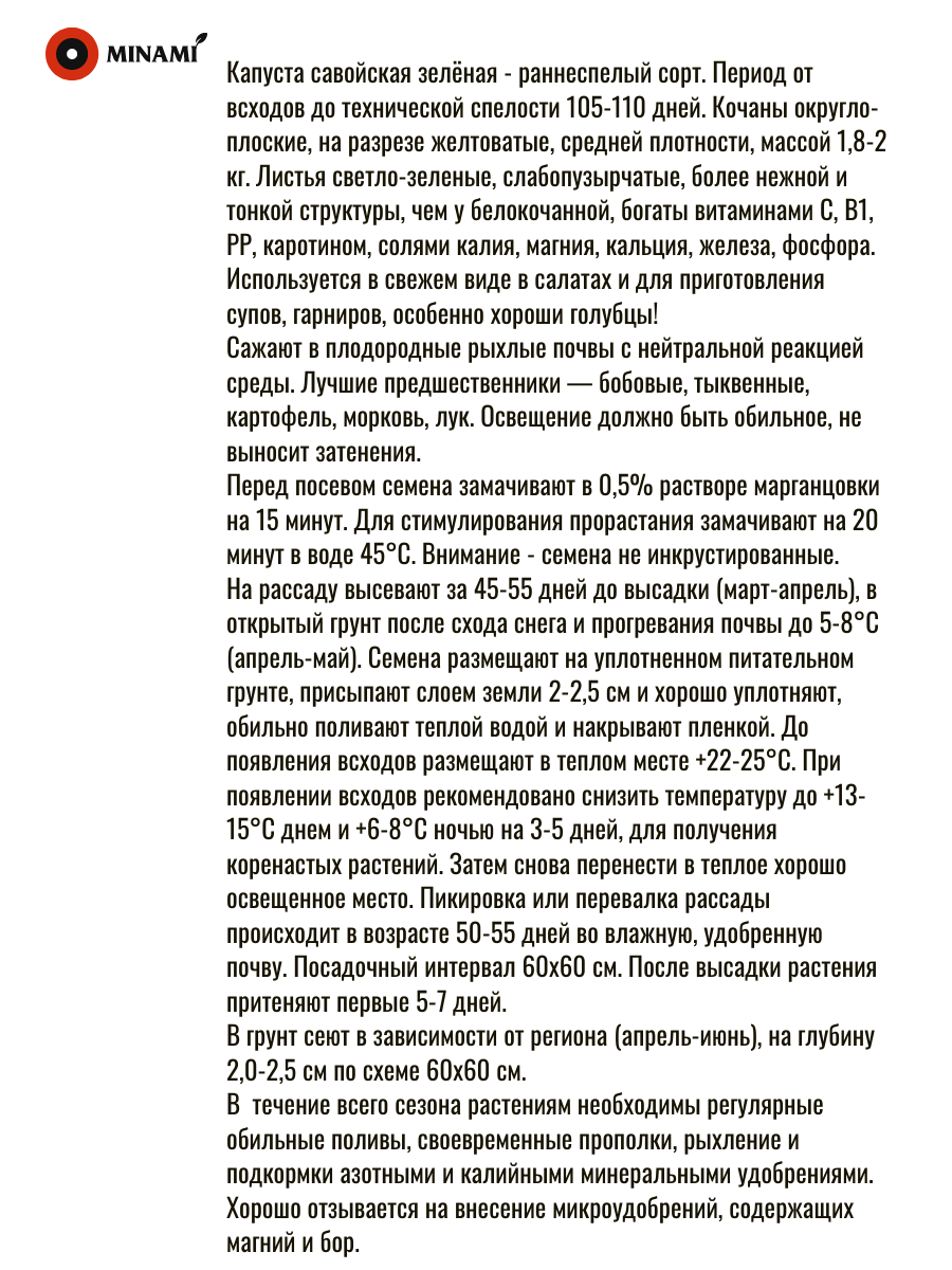 Minami Seeds Капуста савойская зелёная - раннеспелый сорт. Период от всходов до технической спелости 105-110 дней. Кочаны округло-плоские, на разрезе желтоватые, средней плотности, массой 1,8-2 кг. Листья светло-зеленые, слабопузырчатые, более нежной и тонкой структуры, чем у белокочанной, богаты витаминами С, В1, РР, каротином, солями калия, магния, кальция, железа, фосфора. Используется в свежем виде в салатах и для приготовления супов, гарниров, особенно хороши голубцы!