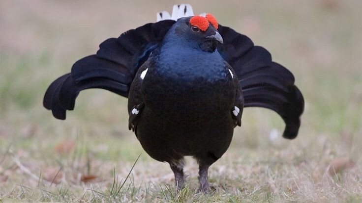 - Самец (косач): Настоящий красавец! Его оперение преимущественно угольно-черное с синеватым или фиолетовым отливом, особенно заметным на солнце. На крыльях выделяются белые пятна, а под хвостом – пушистые белые перья. Самая же отличительная черта самца – это его хвост, который в брачный период раскрывается в виде лиры или двух изогнутых "косиц", отсюда и название "косач". Голова украшена ярко-красными "бровями" – кожистыми наростами, которые становятся особенно заметными во время токования.