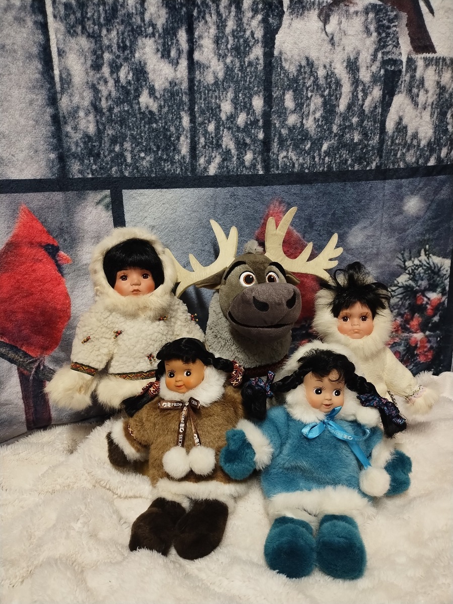 Всем доброго дня! Идет зима, а у меня довольно много кукол именно зимних, разных форматов и направлений. Новогодние и Рождественские Барби, фарфоровые куколки новогодние, и конечно, куклы-сувениры, которые представляют народы Севера. Вот сегодня я как раз и хочу показать вам таких куколок. Они все представляют Аляску - Крайний Север Америки. Ну и конечно, какой же Север без Северного оленя. Поэтому в нашей фотосессии знаменитый Северный олень Свен -из сказки Frozen- "Холодное сердце", которая очень популярна в США . Студия Дисней выпустила несколько мультфильмов по этому сюжету, все знают главных героинь Эльзу и Анну. Эти куклы очень популярны во всем мире. И у меня они тоже есть. Но сегодня у нас другие герои и куколки - жители Крайнего Севера в их национальных нарядах. Эти куколки очень милые, мягкие, добрые, мне они очень нравятся, и я хочу поделиться с вами, дорогие зрители моего канала. Конечно, лучше всего эти куклы смотрелись бы на улице в настоящем снегу на зимнем пейзаже -