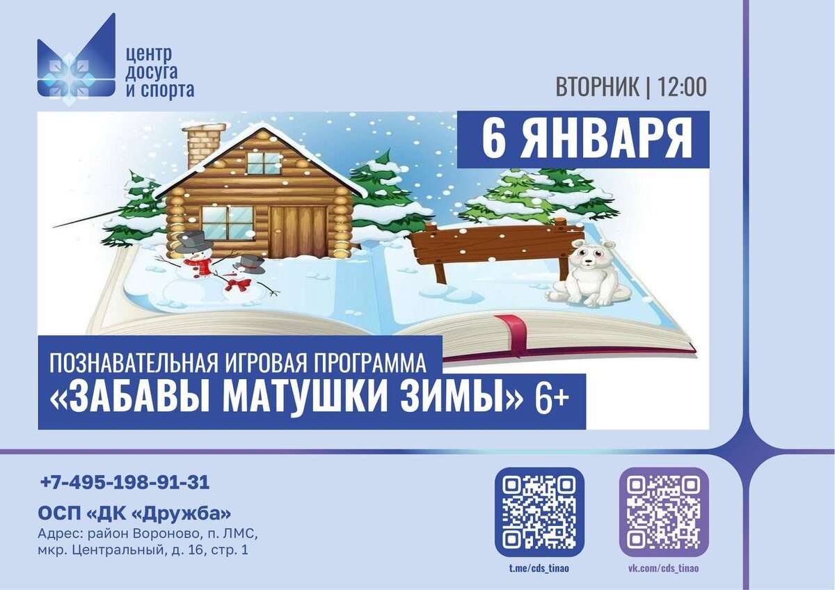 ! 🧠❄ Дорогие друзья! Приглашаем всех любознательных ребят на увлекательную познавательную игровую программу «Забавы матушки зимы»! Это отличная возможность провести время весело и с пользой, узнавая тайны зимней природы! В программе: • Ребята узнают об удивительных особенностях зимней природы и почему зима так важна. • Мы выясним, как зимуют птицы и звери, и как мы можем им помочь. • Участники отгадают интересные зимние загадки, которые проверят их смекалку. • Все желающие смогут поучаствовать в познавательной сказочной викторине! Программа «Забавы матушки зимы» ждёт своих юных исследователей! #анонсывороново #анонсытинао #новоститинао