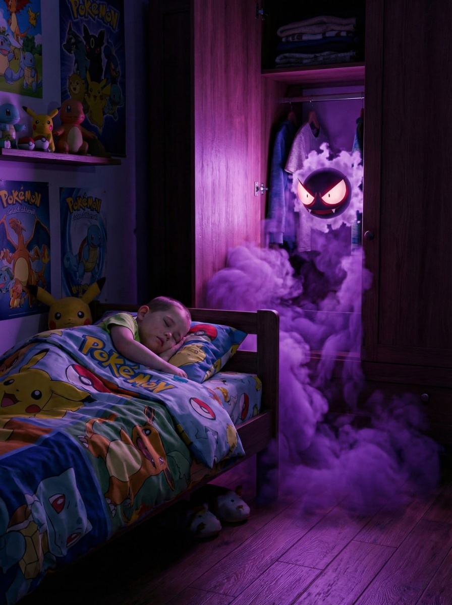🔠🔠🔠🔠🔠🔠🔠⭐️ Промт из серии "Покемоны" 1 из 10 Промт адоптирован для мальчика 5 лет, меняем цифру на нужную и меняем BOY на GIRL 👉Генерирую тут Use the uploaded photo to reference your face and appearance. Keeping the facial features and not changing. Keep 100% similarity. Photo of a 5-year-old boy's nursery, Pokemon fan, Pokemon cartoon-style bed linen. In the frame, there is an open wardrobe with clothes from which Pokemon Gastly looks out in a purple glow from behind the clothes, a light purple smoke that stands out thickly from it to the floor. The room is dark. A boy is sleeping in his bed next to her. Night. purple light falls on objects. close-shot Unreal engine 5 render. octane render. realistic photography, highly detailed textures, 8k resolution, romantic fantasy aesthetic. shot on Canon TX / Canon FD 50mm f/1.8 Kodak Gold 100 Заказать промт или фотосессию. ✉️ Буст канала. ⚡️ #нейросеть #aiфотосессия #промтыдляфотографа #детскийпромт