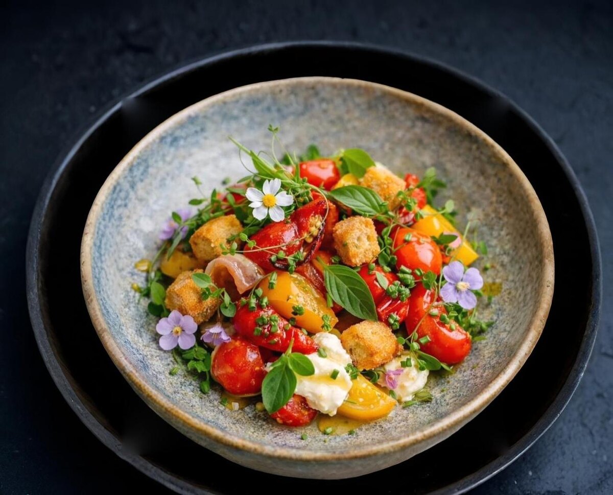 Салат из помидоров с хрустящими гренками, сливочным сыром и зеленью