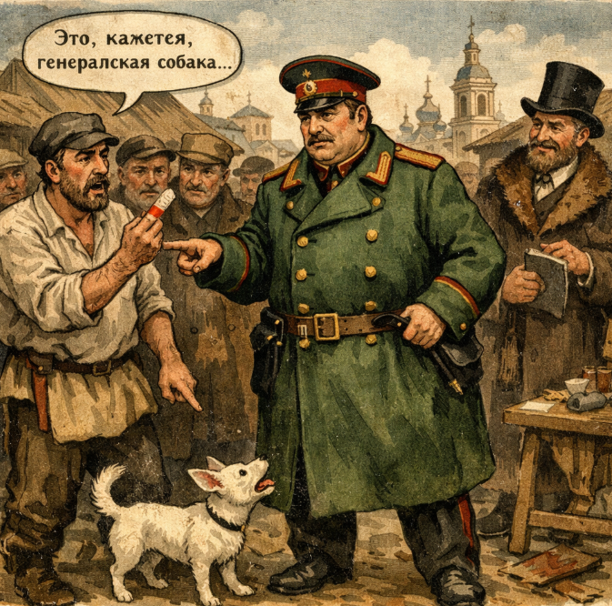 Рассказ Антона Чехова «Хамелеон» — это короткая история о том, как человек меняет свои убеждения в зависимости от выгоды и начальства. Действие происходит на базарной площади. Полицейский надзиратель Очумелов идет по улице и вдруг слышит крик. Оказывается, золотых дел мастер Хрюкин жалуется: его укусила собака за палец. Собака маленькая, белая, с острым носом. Хрюкин требует наказать хозяина и истребить собаку, потому что она, по его словам, бешеная и вообще беспорядок. Очумелов сначала решительно настроен. Он приказывает разобраться, говорит, что собаку надо уничтожить, а хозяина привлечь к ответственности. Но тут кто-то из толпы предполагает, что собака может принадлежать генералу Жигалову. И мнение Очумелова тут же меняется. Он начинает сомневаться: может, Хрюкин сам виноват, может, он нарочно палец подставил, а собачка вовсе не опасная. Дальше выяснение продолжается. То собака вроде генеральская, то вроде не его. И каждый раз Очумелов меняет тон: то грозит Хрюкину, то снова готов