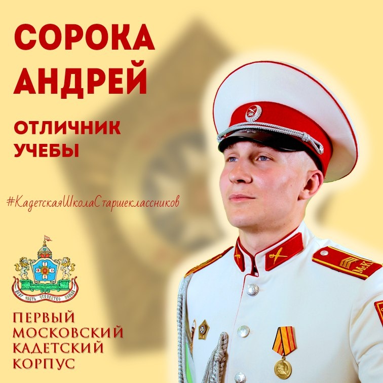 👋 Меня зовут Андрей Сорока, я учусь в 11 «Г» классе Кадетской школы старшеклассников Первого Московского кадетского корпуса. Уверен, что стать одним из лучших в учёбе мне помогла не только природная любознательность, но и железная дисциплина, целеустремлённость и желание постоянно развиваться. Моя главная цель — успешно сдать экзамены, получить золотую медаль и поступить в военный вуз, чтобы в будущем стать офицером Вооружённых Сил РФ. 🏅 Учёба — лишь часть пути. За плечами — серьёзные достижения, которые закалили мой характер. • 15 прыжков с парашютом с разными типами куполов; • участие в параде Победы на Красной площади и параде кадет «Не прервется связь поколений» на Поклонной горе; • 2 года работы в должности заместителя командира взвода; • опыт руководства Советом кадетского самоуправления школы (2023–2024); • благодарность от директора Корпуса генерал-майора В.Я. Крымского; • 1-е место в Спартакиаде кадет Корпуса (2023); • 5 золотых знаков ГТО. 💪 Все это научило меня ответстве