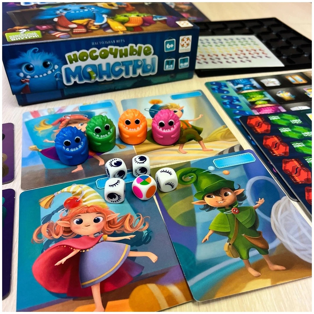 или найди пару своим носкам и не дай себя обокрасть! Представьте себе мир, где ваши потерянные носки превратились в злобных монстриков. Именно в такой вселенной и разворачивается действие детской настолки «Носочные монстры». Задача проста: первым набрать три пары разноцветных носков, спасаясь от коварных чудовищ и ловушек. А носки вам нужны чтобы ваш эльф был одет - одна пара на руки, вторая на ноги и третья на уши! Каждый ход полон сюрпризов: переворачиваешь квадрат игрового поля, находишь свой цвет жетона и тянешь носки из бельевого мешка. Нашел два одинаковых - сразу же надевай их на эльфа, иначе их могут украсть другие игроки. Перемещайся осторожно, иначе рискуешь угодить в логово голодных монстров. Но самое веселье впереди: благодаря уникальным правилам и постепенному открытию новых уровней сложность растет постепенно, поддерживая интерес даже опытных игроков. Трехмерное поле, забавные фигурки, простые и понятные правила позволяют играть даже детям младшего возраста, собирая всю с