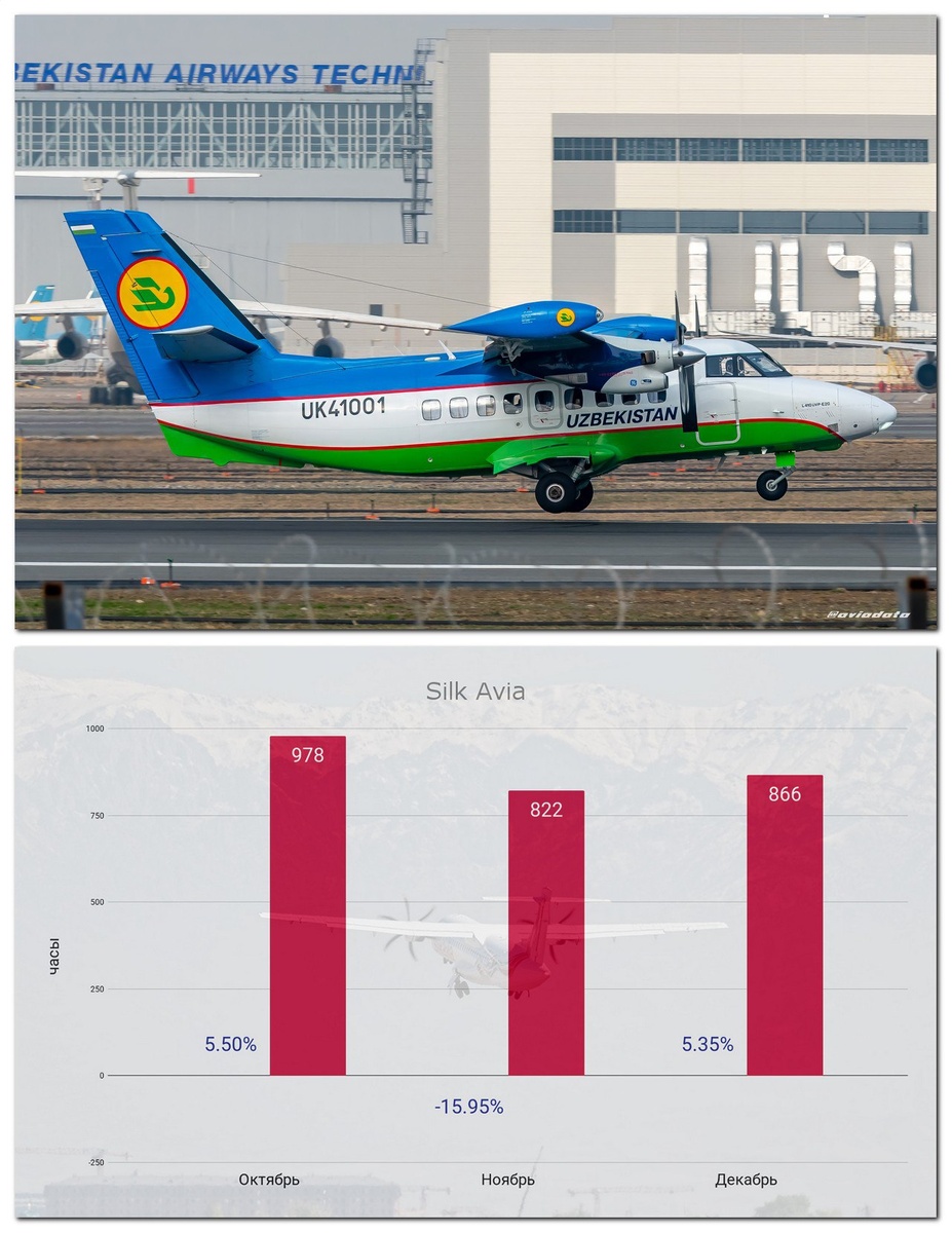 Несмотря на то, что в декабре работало уже всего 5 самолётов из 9, общий налёт относительно ноября немного поднялся. Среднесуточный налёт на одно воздушное судно увеличился ⬆️ на 1.88% и составил 3.06 часа. Суммарное количество часов налёта воздушных судов авиакомпании Silk Avia за декабрь увеличилось 🔼 на 5.35% по сравнению с ноябрём и составило 866 часов. Общая динамика за последние 3 месяца представлена на графике. #статистика #silkavia #декабрь2025