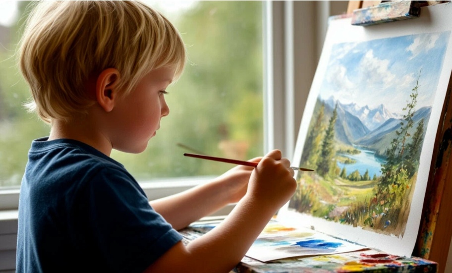 Мольберт у окна светловолосый мальчик старательно выводит кисточкой первые пейзажи. Артём возвращается с работы.