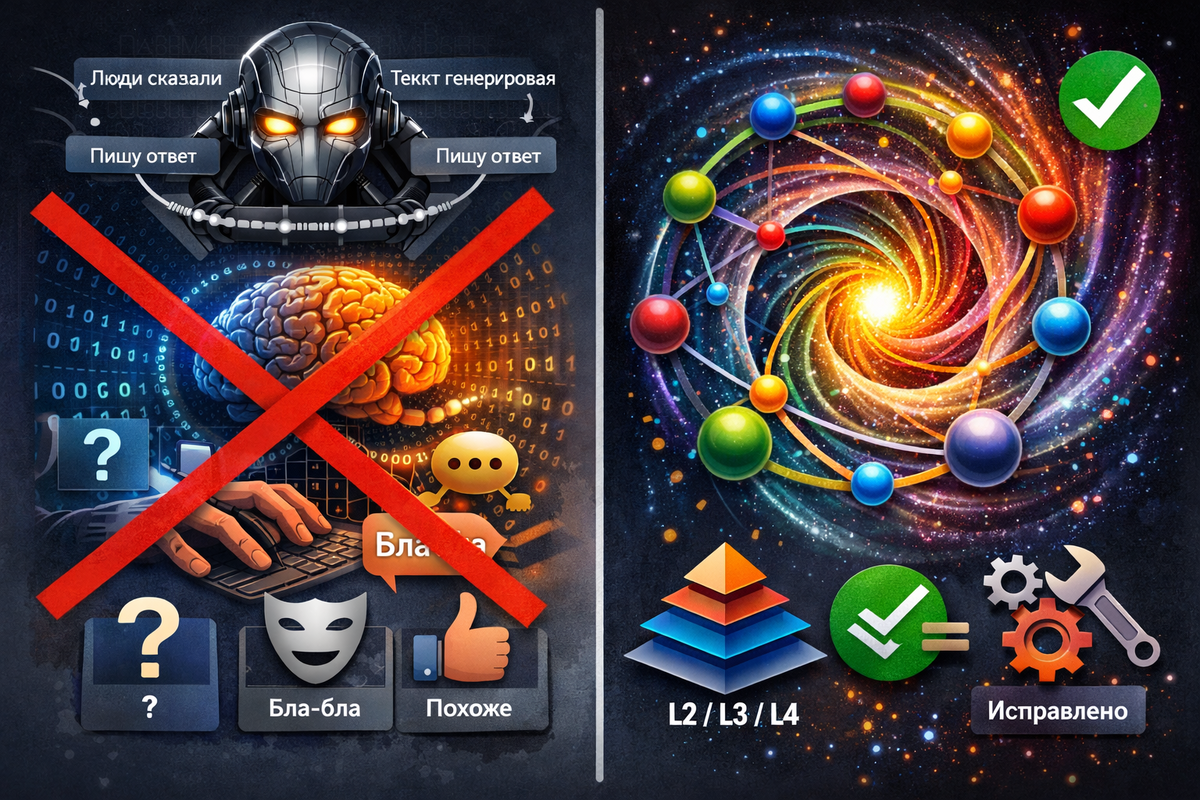 Современный генератор склонен сглаживать конфликт в красивую речь. Мой движок делает обратное: он вытаскивает конфликт на поверхность, сворачивая его в минимальный конфликтный цикл. Это превращает ошибку в диагностируемый объект, а не в спор мнений.