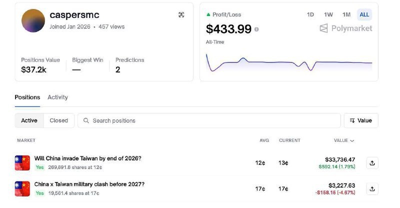 На Polymarket всплыл свежий аккаунт, который без разогрева закинул $34 тысячи на сценарий вторжения Китая на Тайвань в 2026 году