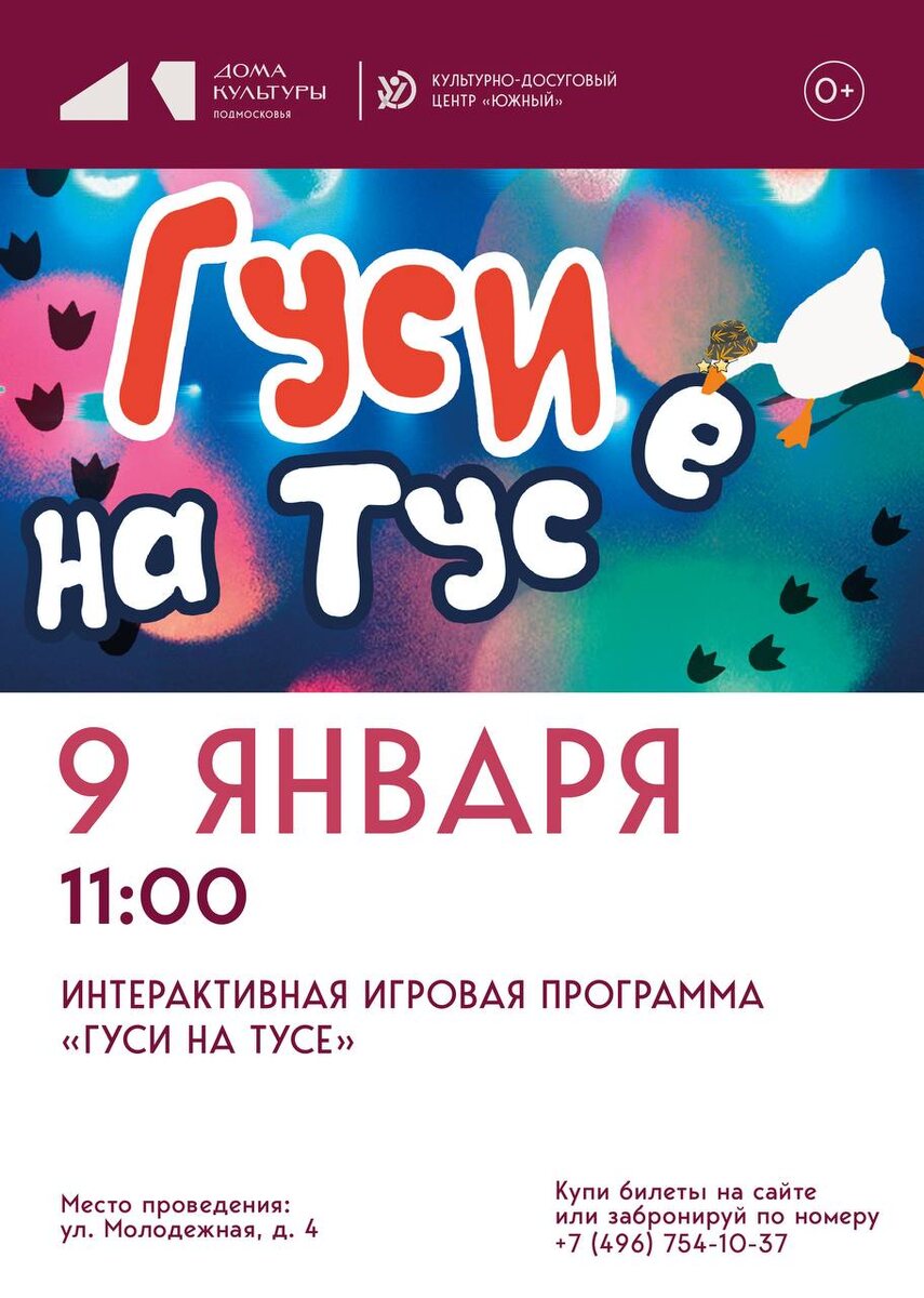 » 🪿Наши гости и их родители окунутся в мир веселья и радости вместе с милыми персонажами программы - гусями Белым и Серым. 🎉Любимые герои станут задорными проводниками не только в мир игр, но и познавательных открытий для самых маленьких. 🚫 Возраст: 0+ 📆 09.01.2026 🕒 11:00 🏢 КДЦ "Южный" 📍 г. Подольск, ул. Молодежная, 4 💰 Цена: 400 ₽ 🎫 Купить билет: https://gusigusi.ticketscloud.org/ #детямПодольск ⭐Поддержать канал голосом 🍰Где поесть в Подольске ✅ Мероприятия Подольск https://dzen.ru/id/66ed500f7b5671493eca3fd6 http://vk.com/podolsk_events http://dzen.ru/podolsk_events